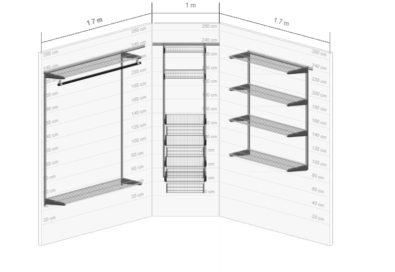 В комплект входят несущие рельсы и навесные направляющие, полки, штанги, аксессуары, крепежные элементы. Можно докупить множество дополнительных компонентов для гардеробной системы.