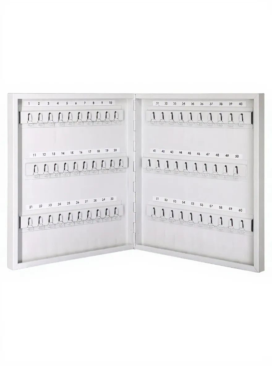 Ключница на 60 ключей представляет собой компактное устройство для удобного хранения большого количества ключей. Ключница комплектуется 6 планками с крючками, что позволяет легко организовать хранение и быстро находить нужный ключ.На задней стенке корпуса расположены отверстия для крепления. В дверь установлен замок типа «Cam-Lock».