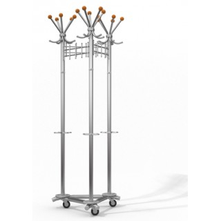 Групповые трехсекционные вешалки типа Гардикс 3-Д (К) с деревянными шарами и на колесах занимают очень мало места. Они особенно удобны для углового размещения. Удобная и вместительная вешалка позволяет компактно разместить большое количество одежды на трех пятирожковых головах и трех решетках, вертикальные штыри которых предназначены для подвешивания как одежды, так и сумок. Четыре полноценные зонтичницы с чашечками для сбора воды позволяют удобно размещать зонты-трости.