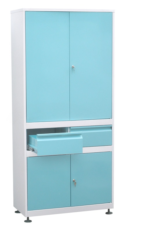 В верхней части шкафа — две металлические запираемые дверцы, три стеклянные полочки.
