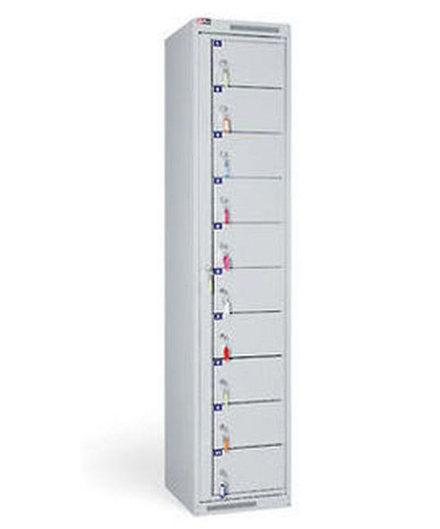 Шкаф металлический на 10 ячеек. Ячейки пронумерованы, каждая ячейка закрывается отдельным замком «EURO-LOCKS». При раскладке корреспонденции в ячейки открывается общая дверь. Шкаф укомплектован бирками для ключей.