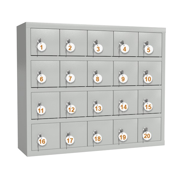 - Металлический шкаф с 20 запираемыми ячейками для хранения мобильных телефонов.