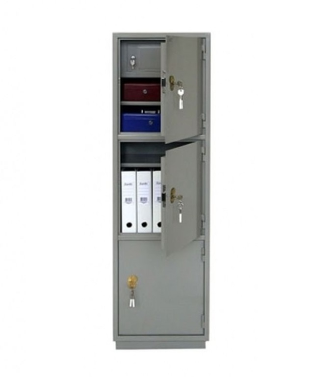 Шкаф представляет собой цельносварную металлическую конструкцию прямоугольной формы, соединение элементов которой выполнены методом сварки сплошным швом по контуру прилегания элементов. Горизонтальная перегородка делит шкаф на 3 независимых отделения, запираемых собственной дверью. В верхнем отделении шкафа «КБС -033т» располагается отсек ограниченного доступа (трейзер), запираемый на замок «почтового» типа и 1 съемная регулируемая по высоте полка, а в среднем и нижнем отделении – по 1 съемной регулируемой по высоте полке. Корпус и двери шкафа изготовлены из стального листа толщиной 1,5 мм. Двери изнутри усилены панелью коробчатого сечения из стального листа толщиной 0,8 мм. В двери шкафа «КБС-033т» – установлен врезной сувальдный замок. Шкаф имеет подиум (подставку) высотой 47 мм для возможности размещения его вплотную к стене. Петли шкафа – внутренние. Окраска изделия – полимерное порошковое покрытие, цвет серый.