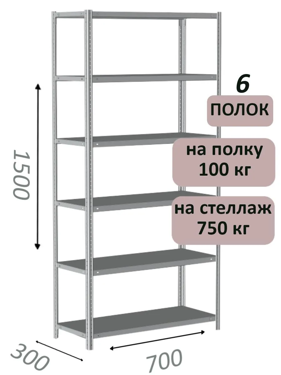 Стеллаж металлический полочный МС 1500х700х300, 6 полок, 100 кг на полку, светло-серый