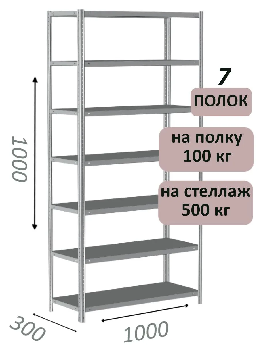 Стеллаж металлический полочный МС-500 1000х1000х300, 7 полок, светло-серый