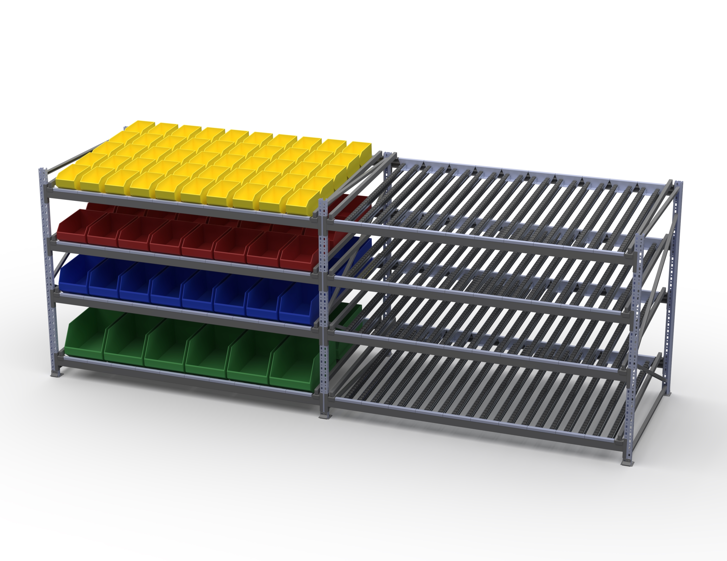 Конструкция с роликовыми полками позволяет организовать хранение по принципу FIFO, при котором пластиковые ящики и короба автоматически подаются к зоне отбора под действием силы тяжести. Это помогает ускорить комплектацию, упростить пополнение запасов и повысить эффективность работы на участках с высоким товарным потоком.