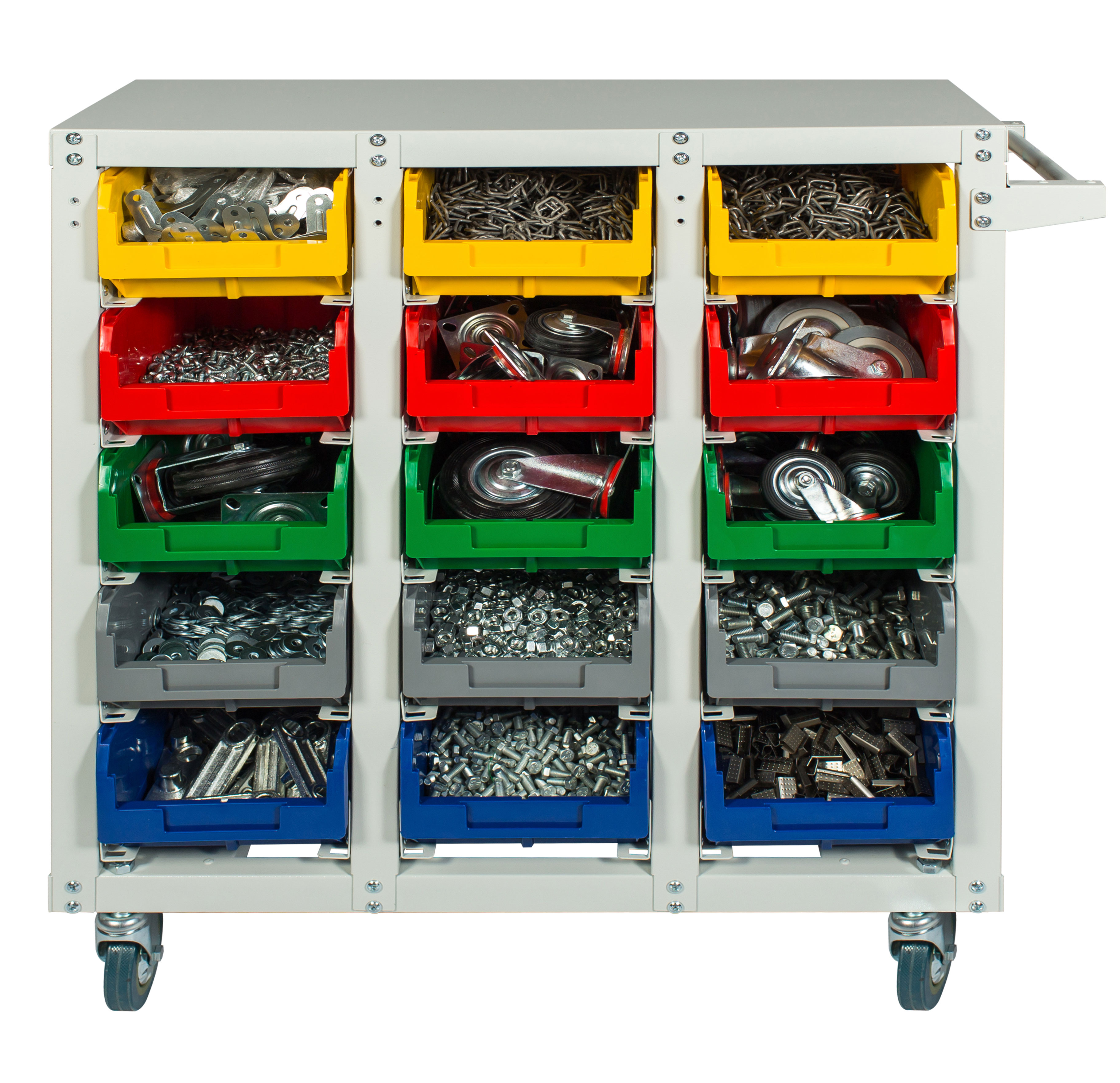 Стеллаж с направляющими мобильный односторонний V3-15 ячеек (125И), грузоподъемность 350кг. Предназначен для размещения контейнеров V-3 в отдельных ячейках на продольных направляющих. Подходит для эксплуатации в автомастерских, в строительных магазинах, на складах, где необходимо складирование мелкоштучных изделий и инструментов. При использовании вместе с колесами и ручкой, данный стеллаж становится мобильным, что значительно расширяет его функциональные возможности для перемещения вещей по территории предприятия, склада, цеха. Конструкция ящиков модели V3 обеспечивает быстрый и легкий доступ. Ящики открытого типа позволяют быстро находить нужные позиции, это возможно благодаря хорошему визуальному обзору содержимого. Конструкция стеллажа позволяет одним движением руки извлекать нужный ящик для его наполнения или опустошения, и так же легко устанавливать его на место. Стеллаж поставляется в разобранном виде и состоит из: металлического каркаса стеллажа с направляющими одностороннего V3-15 ячеек - 1 шт.; ящиков пластиковых модель V-3 - 15 шт.; комплекта итальянских колес Tellure Rota, резина, сталь диаметром 150мм.; ручки. Температурный режим эксплуатации от +20 до +70С.