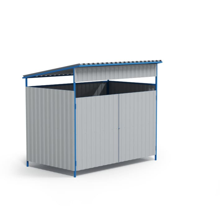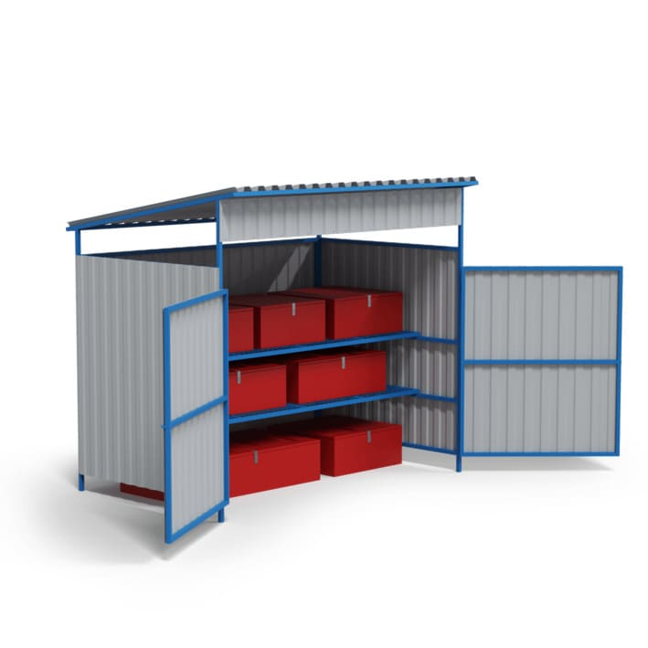 Конструкция выполнена из профильной трубы и профнастила, что обеспечивает надёжную защиту содержимого. Рекомендуется устанавливать площадку на ровное бетонное основание для обеспечения устойчивости и долговечности эксплуатации. Благодаря разборной конструкции возможна удобная транспортировка и сборка на месте установки.