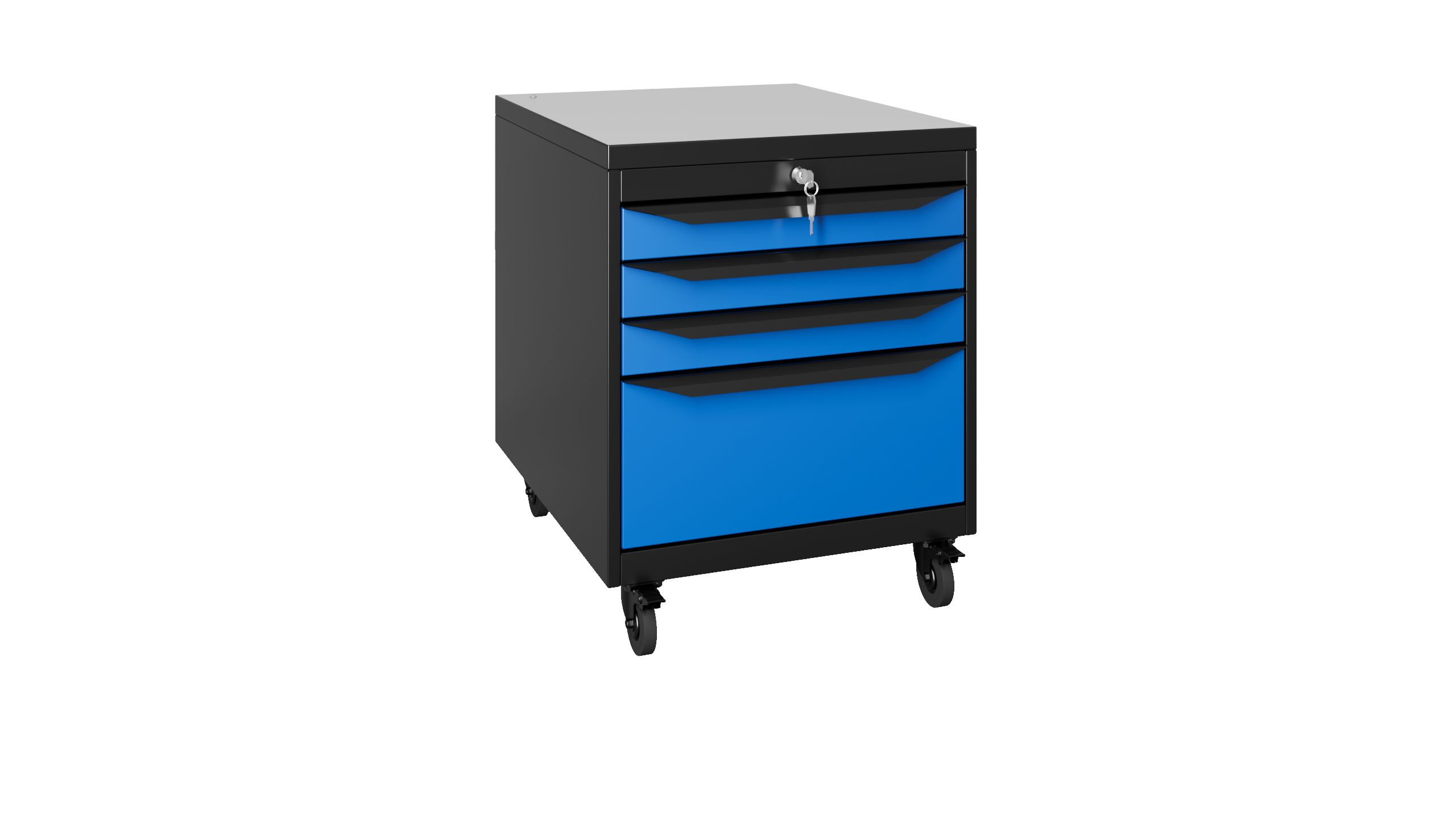 Окраска элементов корпуса осуществляется порошковой антистатической краской: RAL 9011 (темный графит), дверцы RAL 5023 (синий), столешница RAL 7047 (серый).