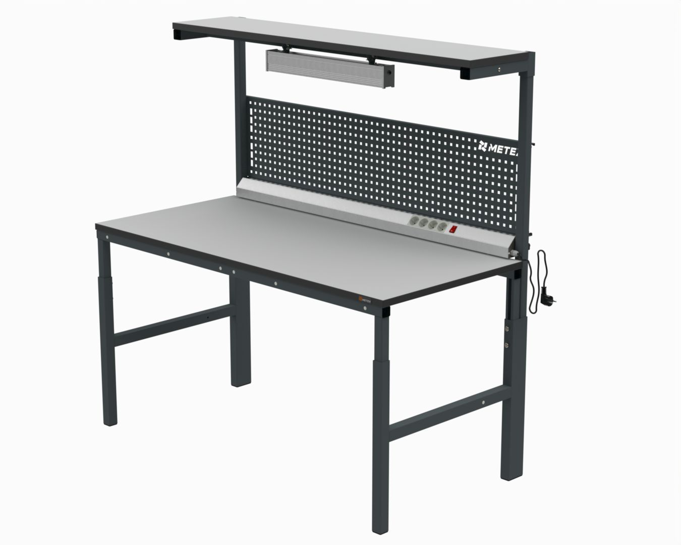 В комплект стола входит стол серии 41.Б, комплект задних стоек, верхняя полка шириной 300 мм, перфорированный экран, электромонтажная панель и светодиодный светильник 600 мм под полку.