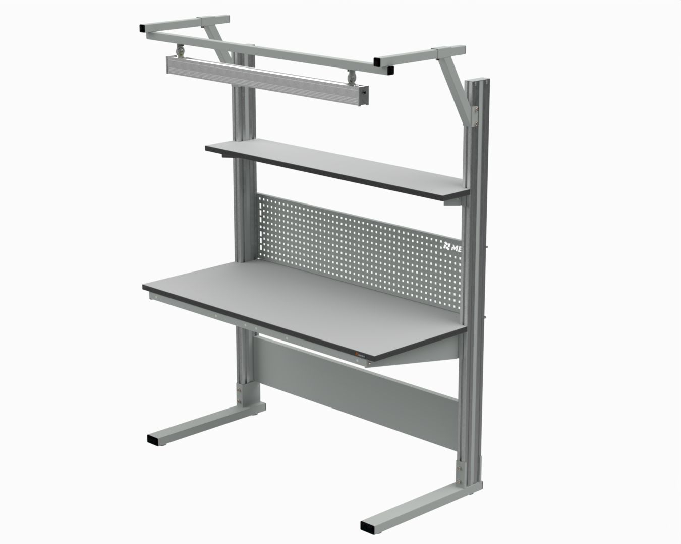 В комплект входят стол из серии "Современный", верхняя полка шириной 300 мм, перфорированный экран, набор для установки освещения и светодиодная лампа.
