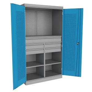 Максимальная распределенная нагрузка на шкаф составляет 400кг. Максимальная равномерно распределённая нагрузка на полку 50кг, выдвижной ящик 40кг. Шкаф оснащен замком «Евролок». Окраска элементов корпуса осуществляется порошковой полимерной краской: RAL 7037 (пыльно-серый), а дверцы RAL 5015 (небесно-синий) – складская программа, RAL 3003 (красный) – под заказ. Все шкафы отгружаются со склада в разобранном виде. Инструкцию по сборке вы можете скачать с нашего сайта.