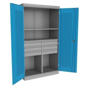 Максимальная распределенная нагрузка на шкаф составляет 400кг. Максимальная равномерно распределённая нагрузка на полку 50кг, выдвижной ящик 40кг. Шкаф оснащен замком «Евролок». Окраска элементов корпуса осуществляется порошковой полимерной краской: RAL 7037 (пыльно-серый), а дверцы RAL 5015 (небесно-синий) – складская программа, RAL 3003 (красный) – под заказ. Все шкафы отгружаются со склада в разобранном виде. Инструкцию по сборке вы можете скачать с нашего сайта.
