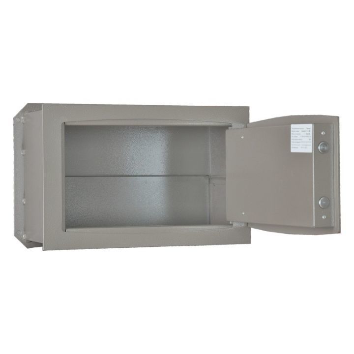 Дверь шкафа оснащена сейфовым замком сувальдного типа. Корпус сейфа толщиной 2 мм, лицевая панель и дверь толщиной 5 мм. На задней стенке корпуса расположены отверстия для крепления.