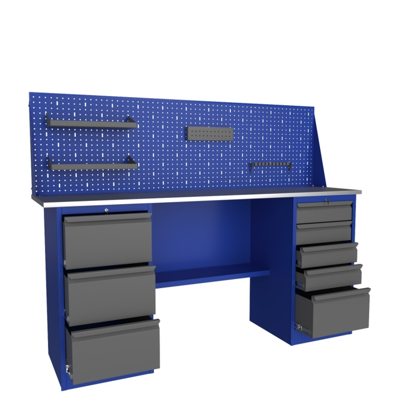 В качестве опор служат две тумбы - с тремя и пятью ящиками. Каждая тумба оснащена центральным замком. Верстак имеет экран, который содержит удобные подвески для инструментов. Изделие покрыто качественной порошковой краской, которая не трескается со временем.