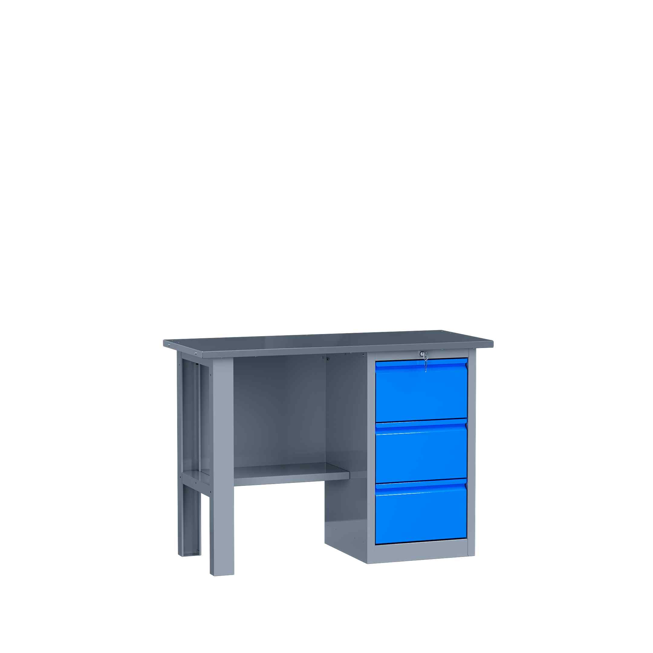 Верстак создаст для вас удобное рабочее место: в комплектации имеется одна большая тумба, нижняя полка. Тумба имеет три ящика, которые используются для удобного складирования инструментов.
