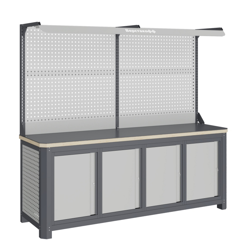 Экран (перфорированная панель) верстака выполнен с квадратной перфорацией 12х12 мм с шагом 38 мм для установки крючков, держателей и других аксессуаров. Экран крепятся к столешнице с помощью специальных кронштейнов. Максимальная масса груза, равномерно распределенного по поверхности экрана, составляет 71 кг.