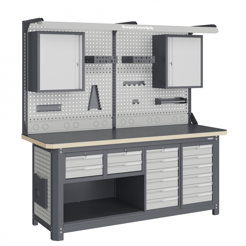 Верстак серии MECHANIC: MCN 2052.S2266.22-2FR состоит из столешницы шириной 1993 мм, рамы верстака, состоящей из опор, перемычек, боковых перфопанелей, двух модулей S6, два модуля S2 c комплектами полка-стенка SW2, двойного экрана с кронштейнами, комплекта освещения и блока коммуникаций.