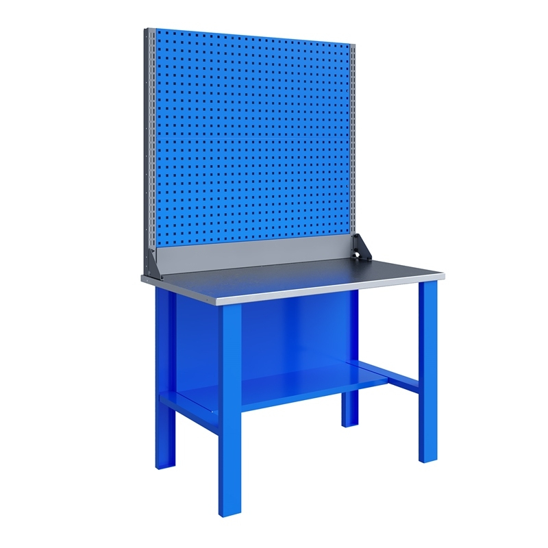 Верстак имеет декларацию соответствия ТР ТС 025/2012 «О безопасности мебельной продукции». Верстак имеет сертификат соответствия ГОСТ Р 58863-2020 «Столы производственные. Верстаки из металла. Общие технические условия». Столешница состоит из листа влагостойкой фанеры марки ФСФ толщиной 24 мм, которая покрыта лаком-антисептиком и листом оцинкованной холоднокатаной стали толщиной 1,2 мм. Глубина столешниц 696 мм. Двойной экран (перфорированные панели) верстака выполнен с квадратной перфорацией 12х12 мм с шагом 38 мм для установки крючков, держателей и других аксессуаров. Экран крепится к столешнице с помощью специальных кронштейнов.