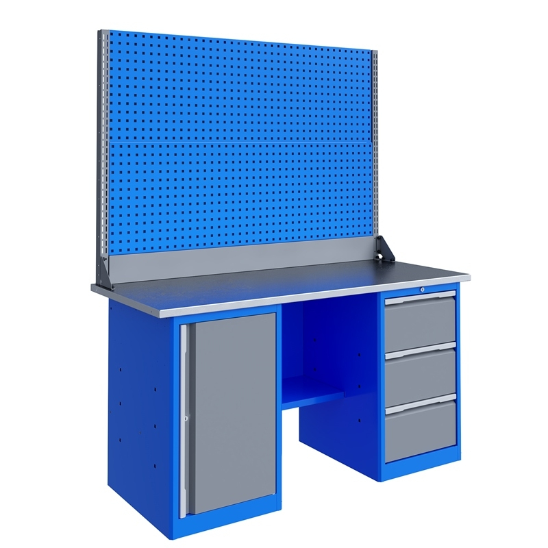 Верстак серии Technic 161.37.1-2 состоит из столешницы шириной 1596 мм, тумбы P3 с тремя большими ящиками, тумбы P7 с дверью и двумя полками, полки-стенки, двойного экрана с кронштейнами